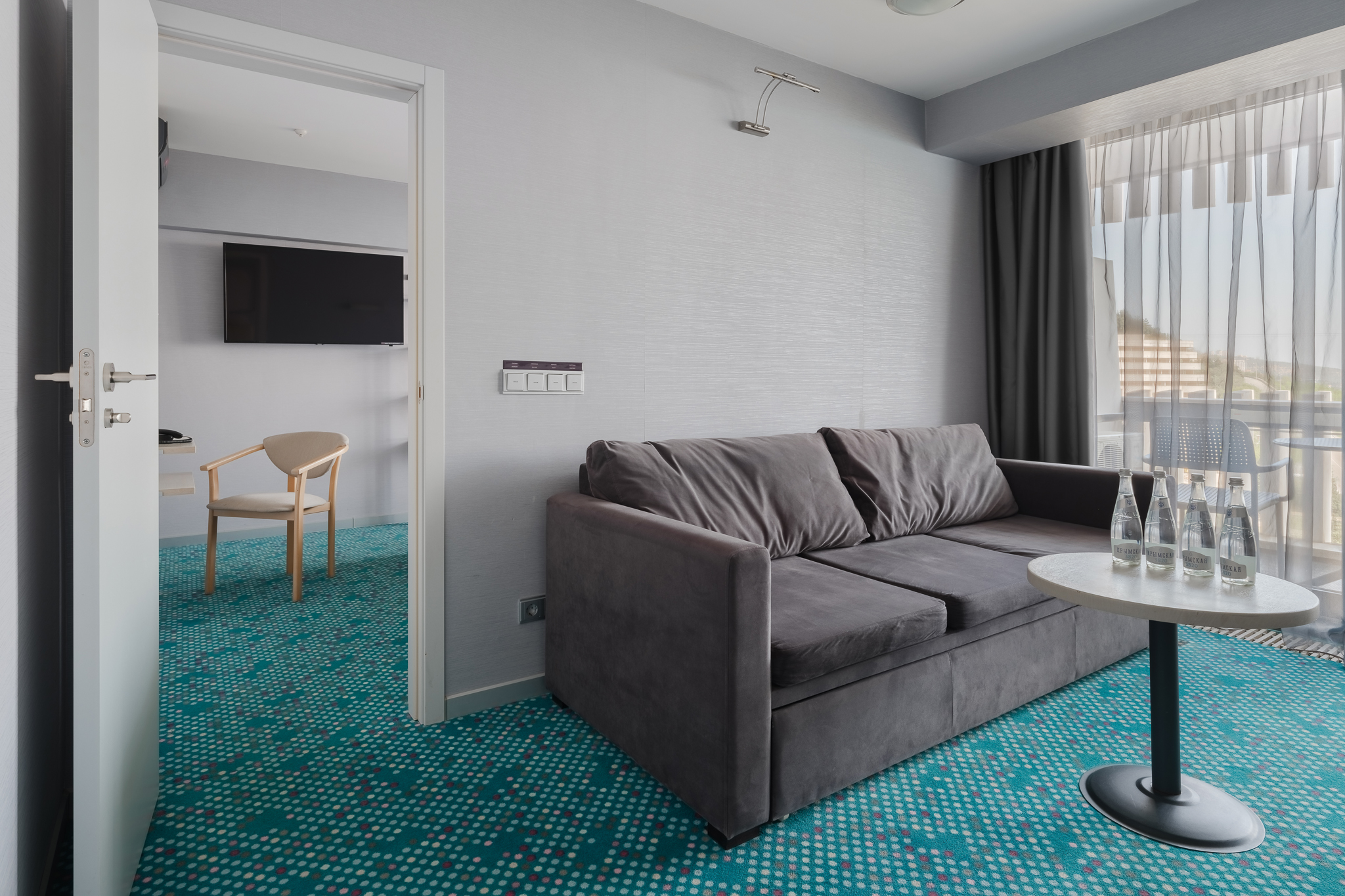 Двухкомнатный номер включает спальню с двуспальный кроватью king-size, гостиную, 2 ванные комнаты с душем/ванной, балкон с видом на море и горы. К услугам гостей кондиционер, телевизор, телефон, мини-бар, сейф, фен, туалетные принадлежности.