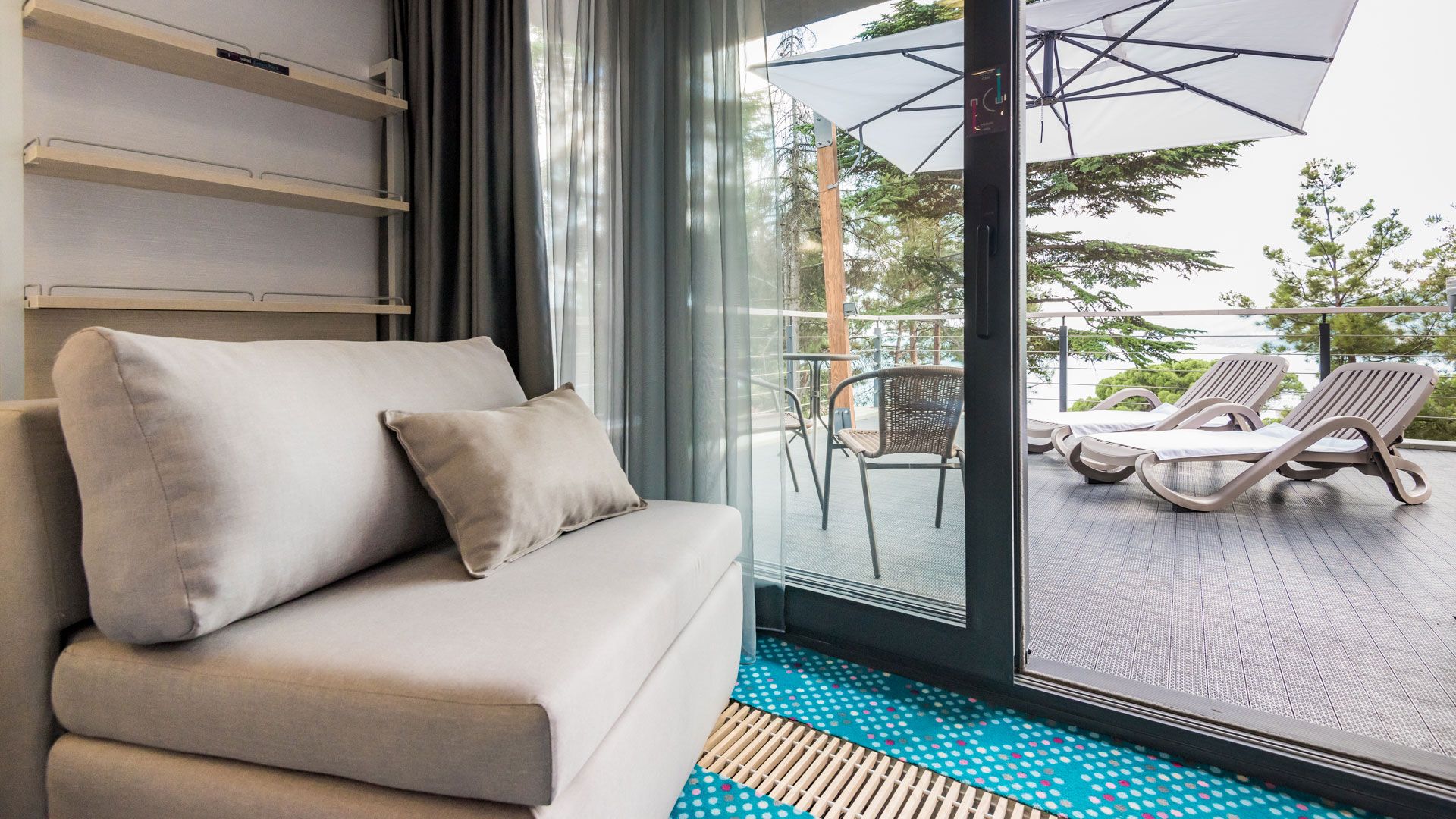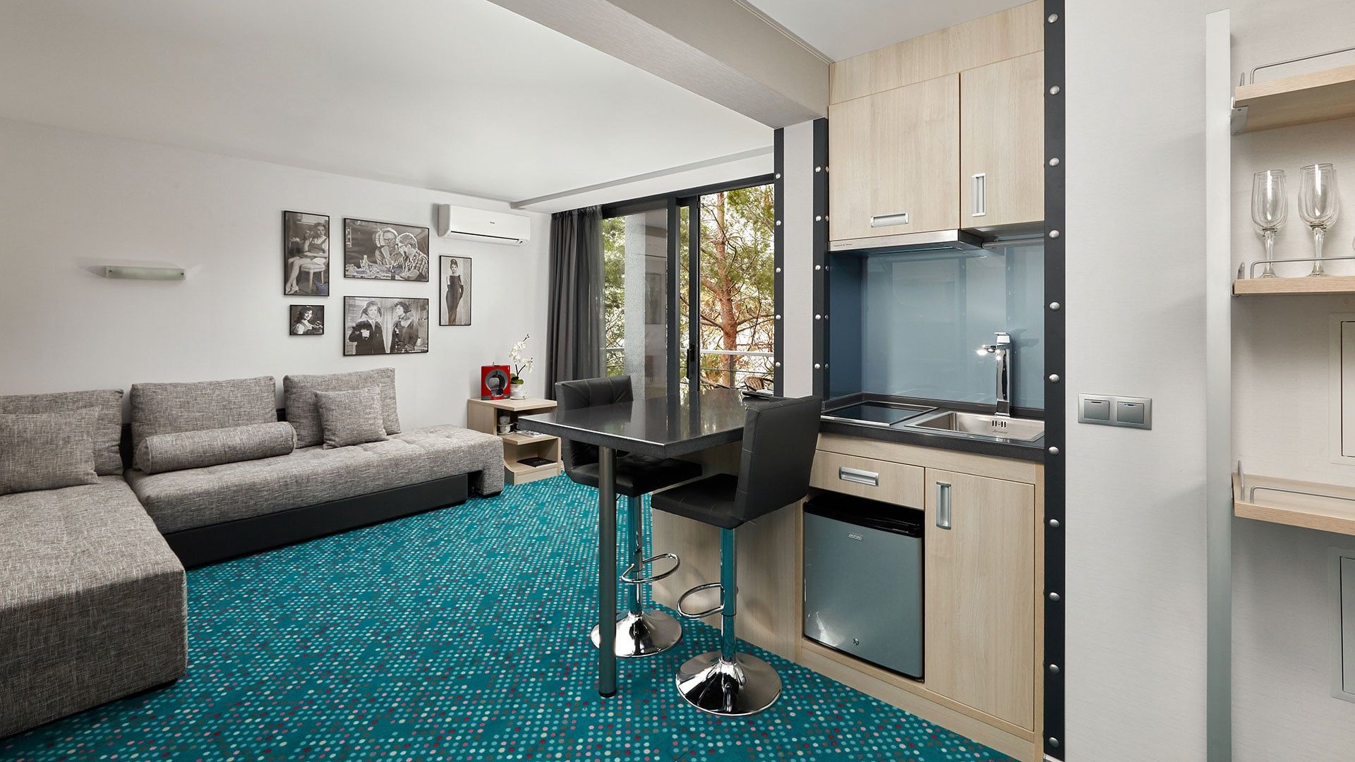 Апартаменты включают спальню с двуспальной кроватью king-size и гостиную с кухней. С балкона открывается вид на море и парк. Санузел оснащен ванной, феном, туалетно-косметическими принадлежностями. В числе прочих удобств кондиционер, телевизор, телефон, сейф.