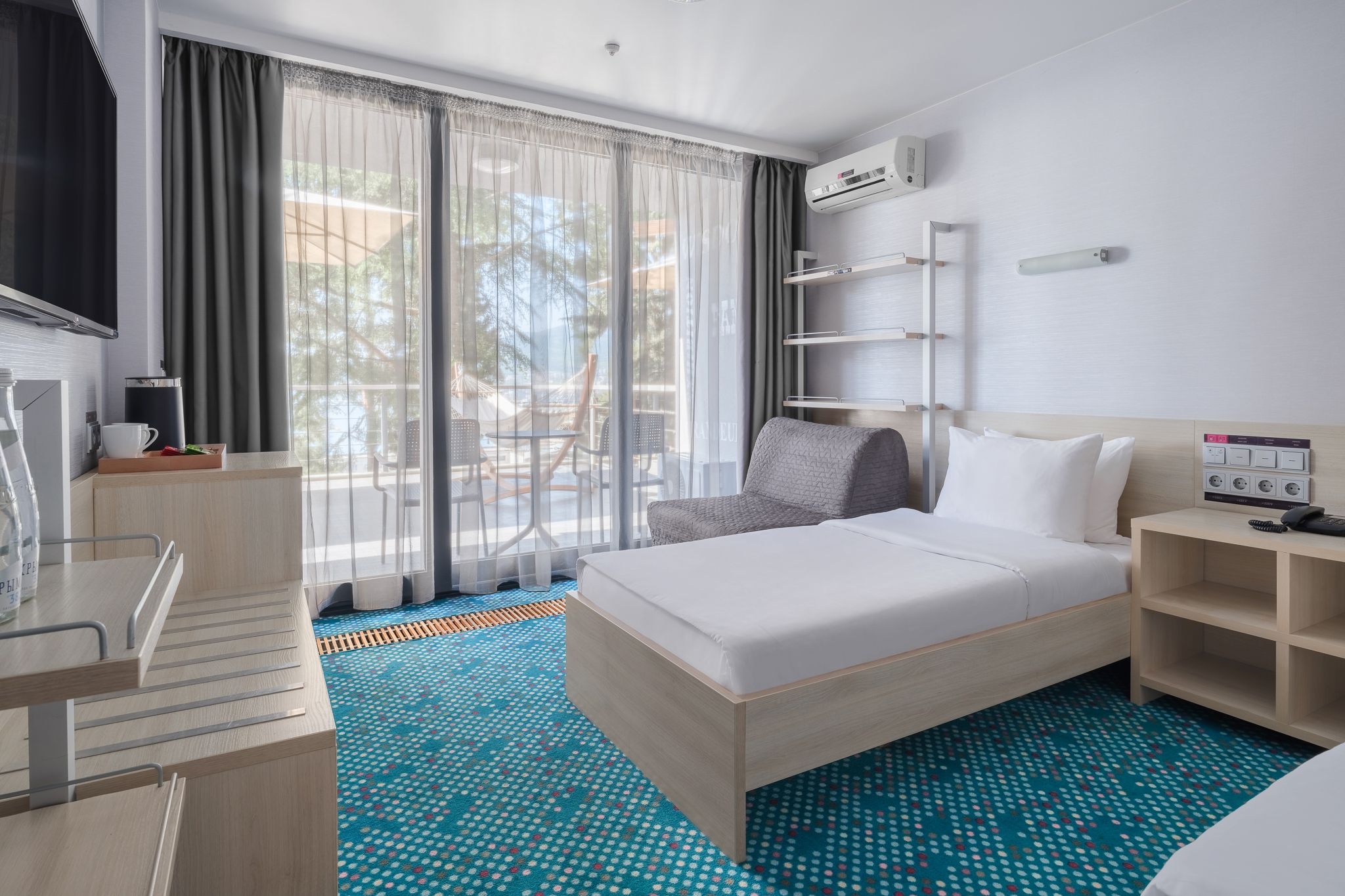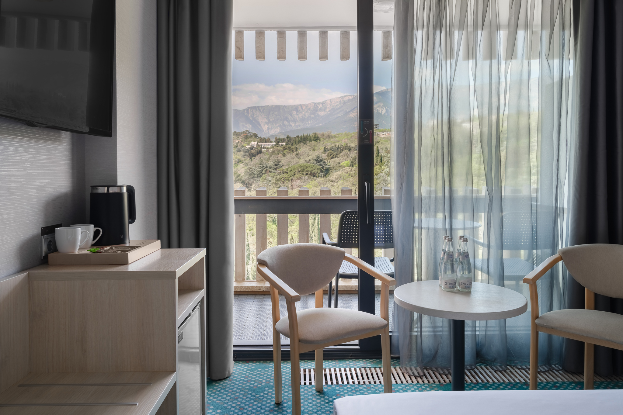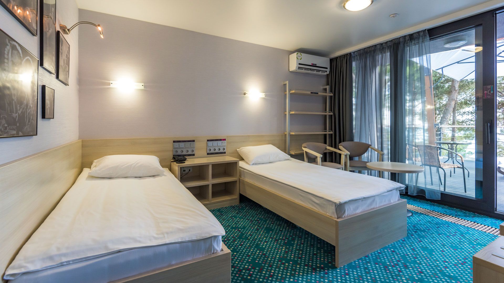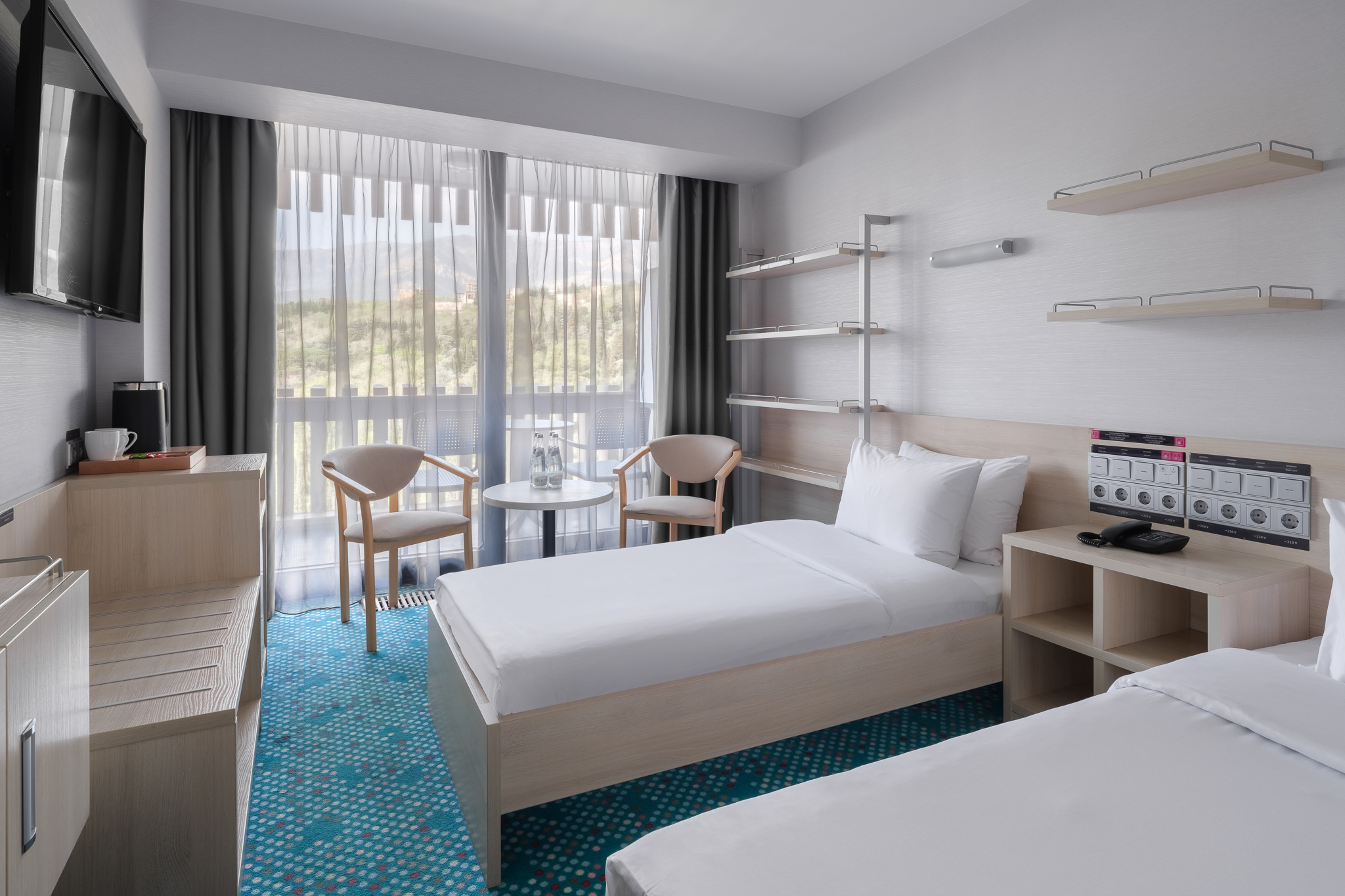 Комплектация номера включает 2 односпальные кровати, кондиционер, телевизор, телефон, сейф. В числе прочих удобств Wi-Fi, набор для приготовления чая и кофе, туалетно-косметические принадлежности, фен. Ванная комната с душем. Имеется балкон с видом на море и горы.