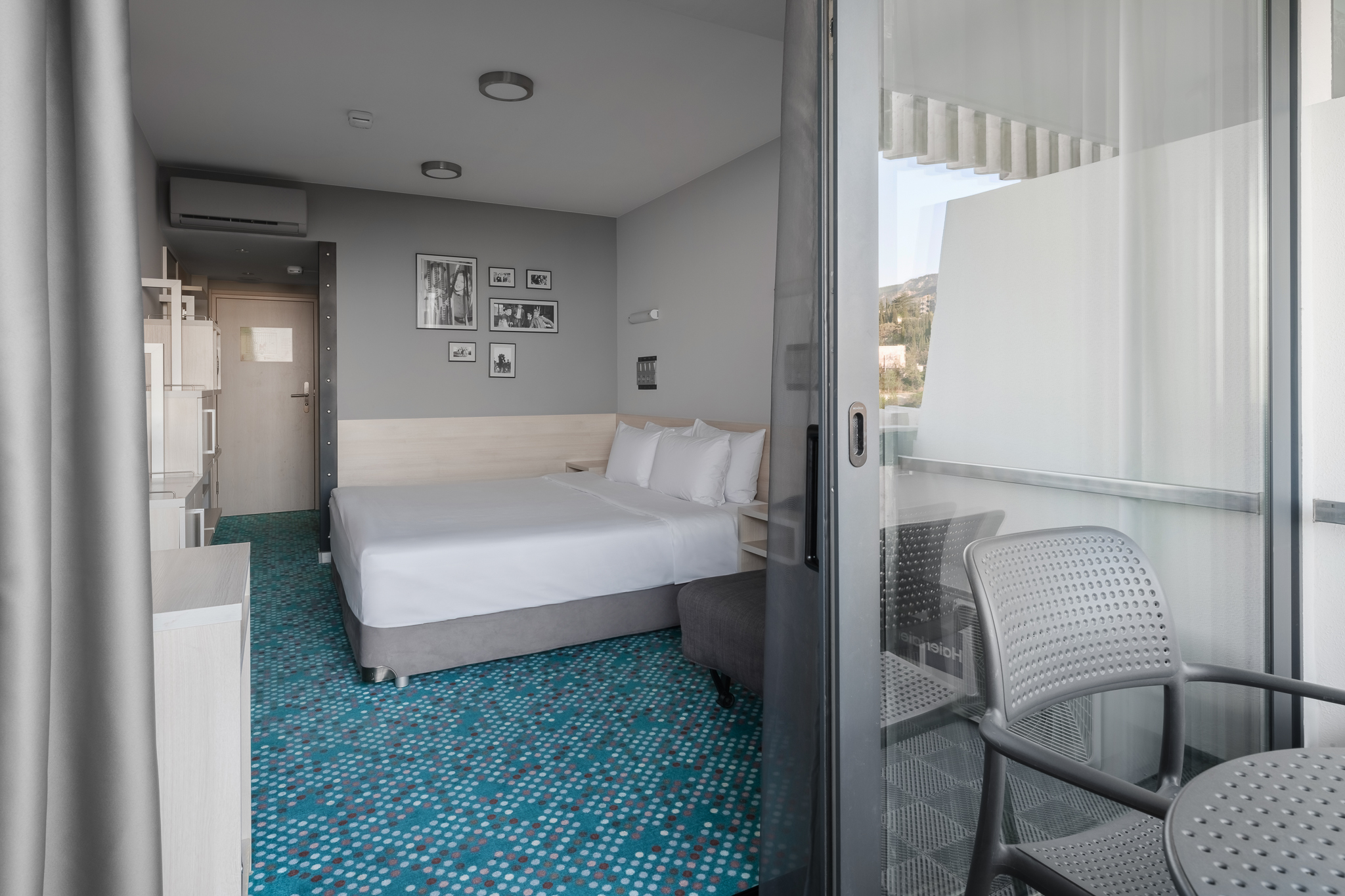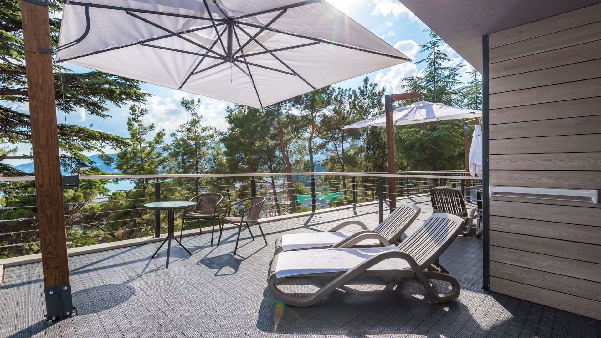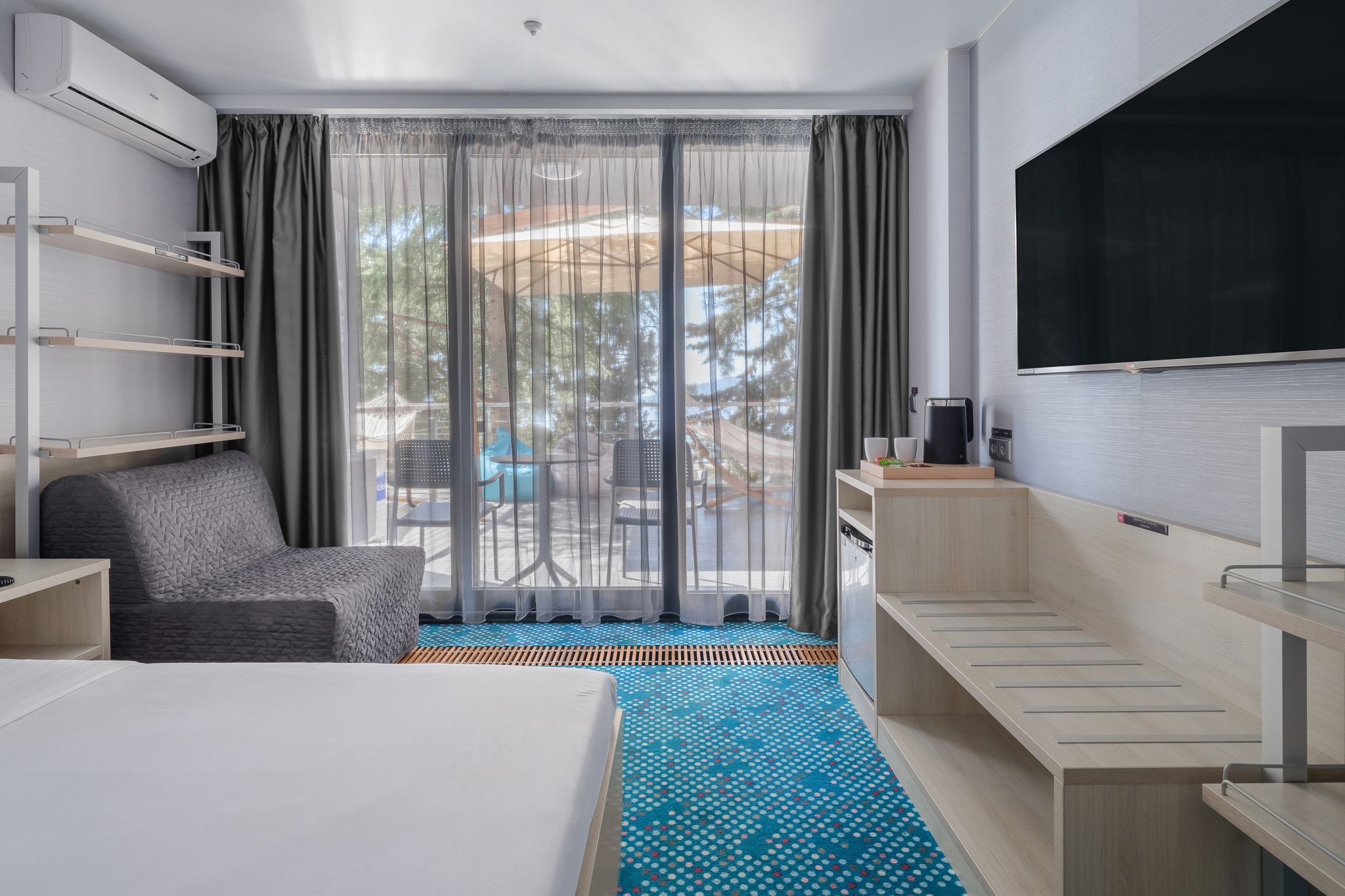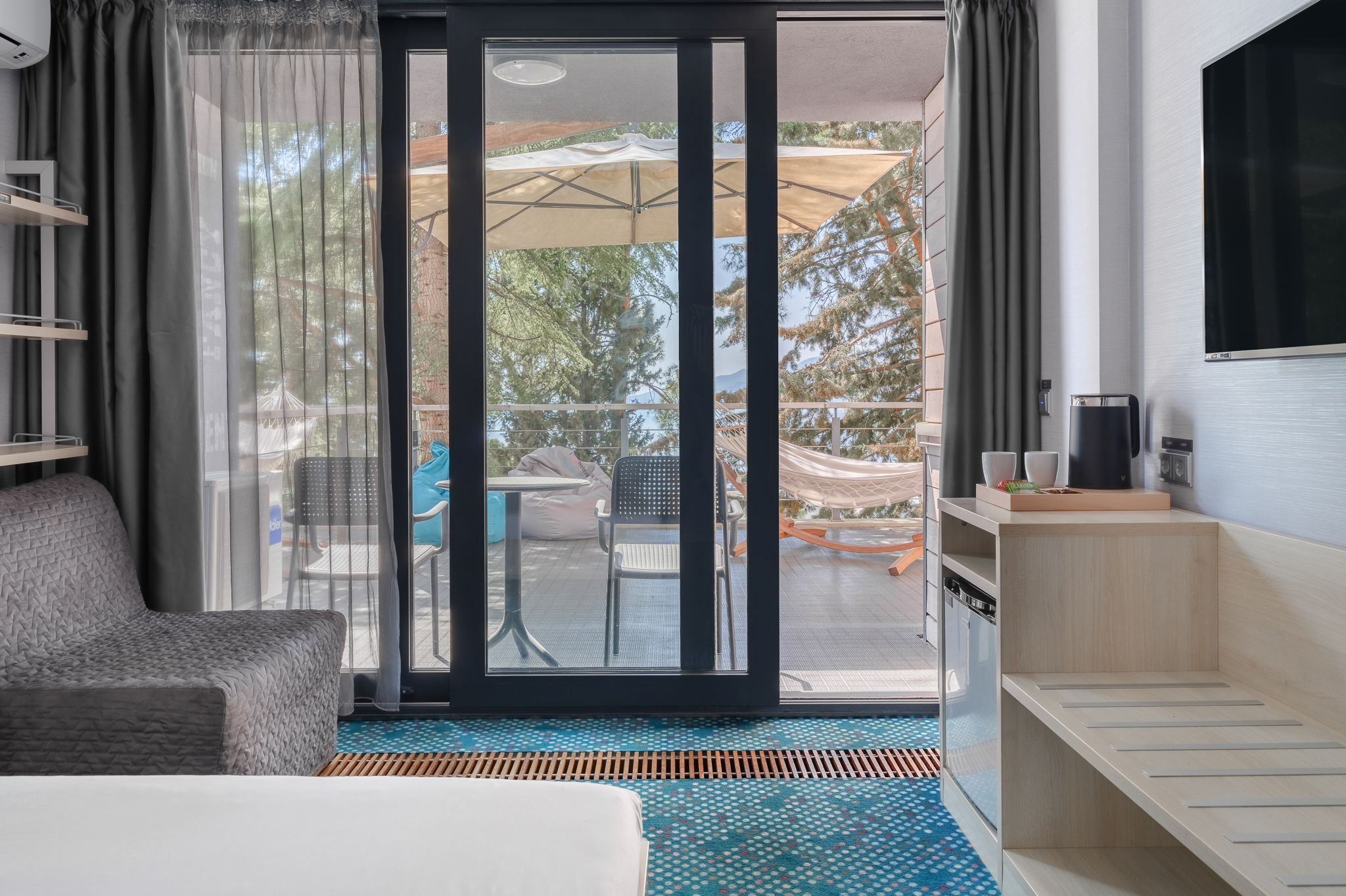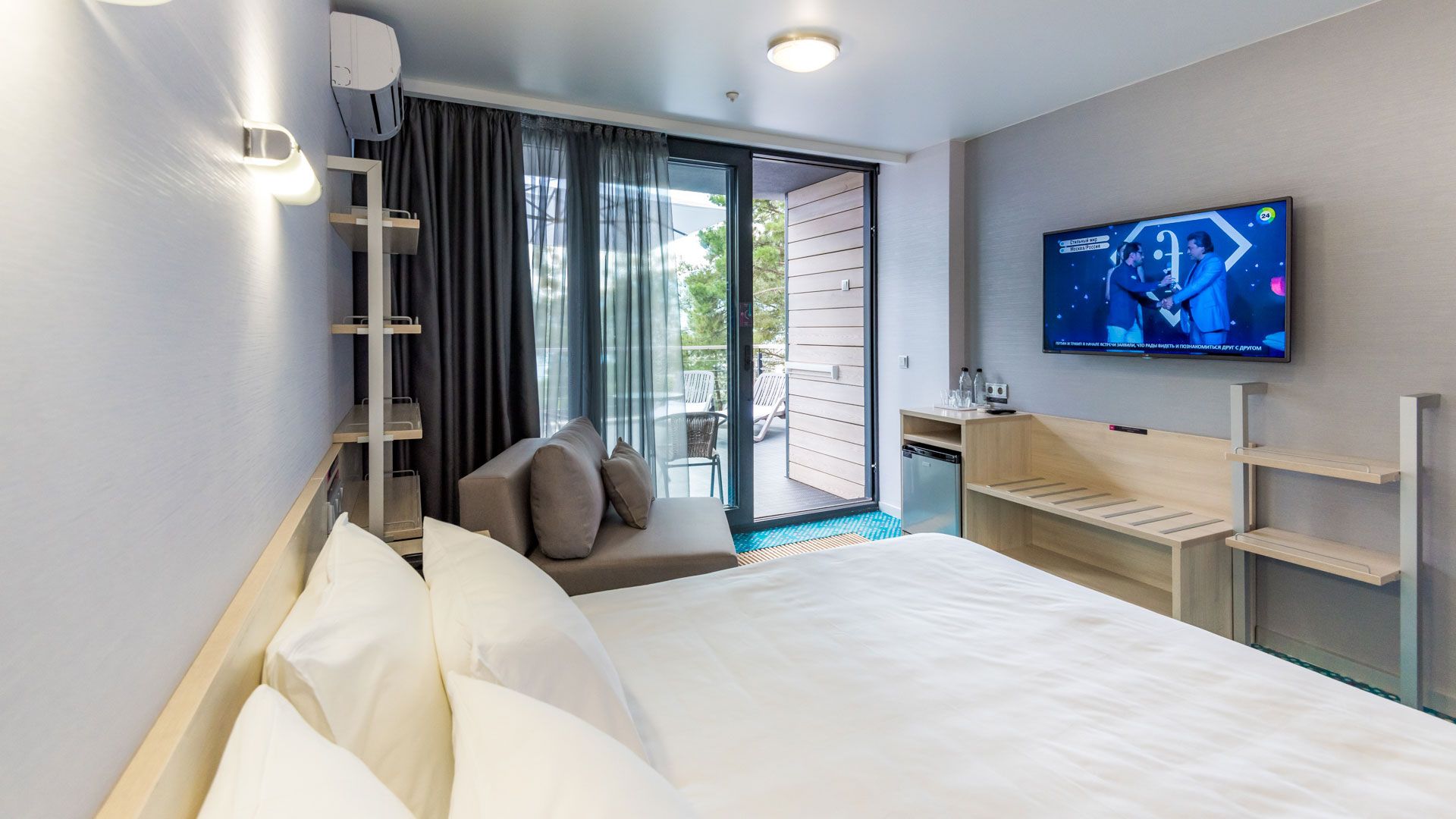 Комплектация номера включает 2 односпальные кровати, кондиционер, телевизор, телефон, сейф. В числе прочих удобств Wi-Fi, набор для приготовления чая и кофе, туалетно-косметические принадлежности, фен. Ванная комната с душем. Имеется балкон с видом на море и горы.