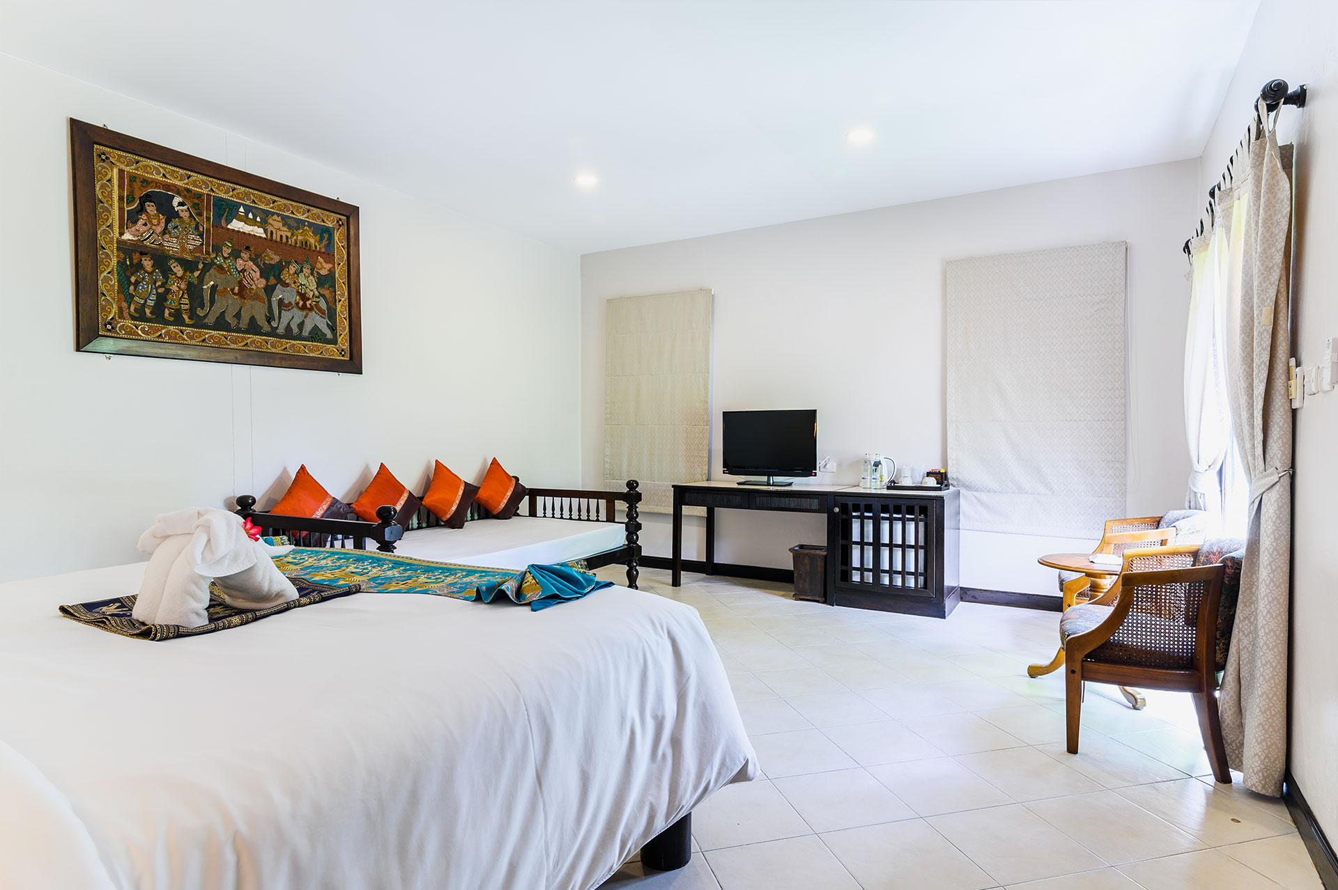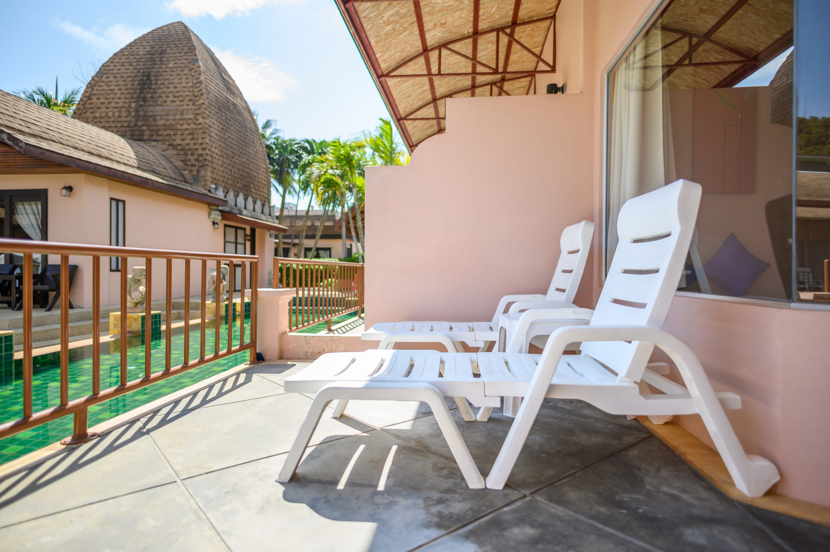 Замечательный отель! Прекрасное расположение - напротив большой рынок еды - на любой вкус! Пляж чистейший через дорогу, море лазурного цвета и острова не нужны кафешки, массажные салоны, магазинчики и аптеки - все в шаговой доступности Мы не первый раз в Тае, на Пхукете 2 раз - отель выбирали в спокойном месте, так как с мужем были вдвоём Отель состоит из 160 домиков бунгального типа, очень зелёная территория, которую убирают каждый день. На первой линии дома располагаются возле большого бассейна. У нас был 520 домик на второй линии - свой мини дворик, веранда - скамейка столик - очень удобно! И бассейн рядом с нашим домом. Сам номер довольно большой - большая кровать - очень удобный матрац, доп. кровать шкаф, стол с чайными принадлежности, телевизор - мебель, особенно ванная комната подуставшие, но нам это было неактуально Кондиционер можно было регулировать... Белье меняли каждые 2 дня, полотенца каждый день. Уборка каждый день. Полотенца были и банные и пляжные. Завтрак стандартный, выбор небольшой, но нам хватало вполне. Персонал дружелюбный не говорит по-русски, общались на английском через переводчик. Единственный минус для нас - очень мелкие бассейны, но мы 2 раза всего в них купались, так как дважды в день ходили на пляж Да, ещё очень удобно, что обменников много, причём самый выгодный курс был прямо на рынке. Если вам не очень актуально жить в шикарном номере - однозначно рекомендую этот отель! Однозначно ещё раз, уже с сыном поедем именно сюда!