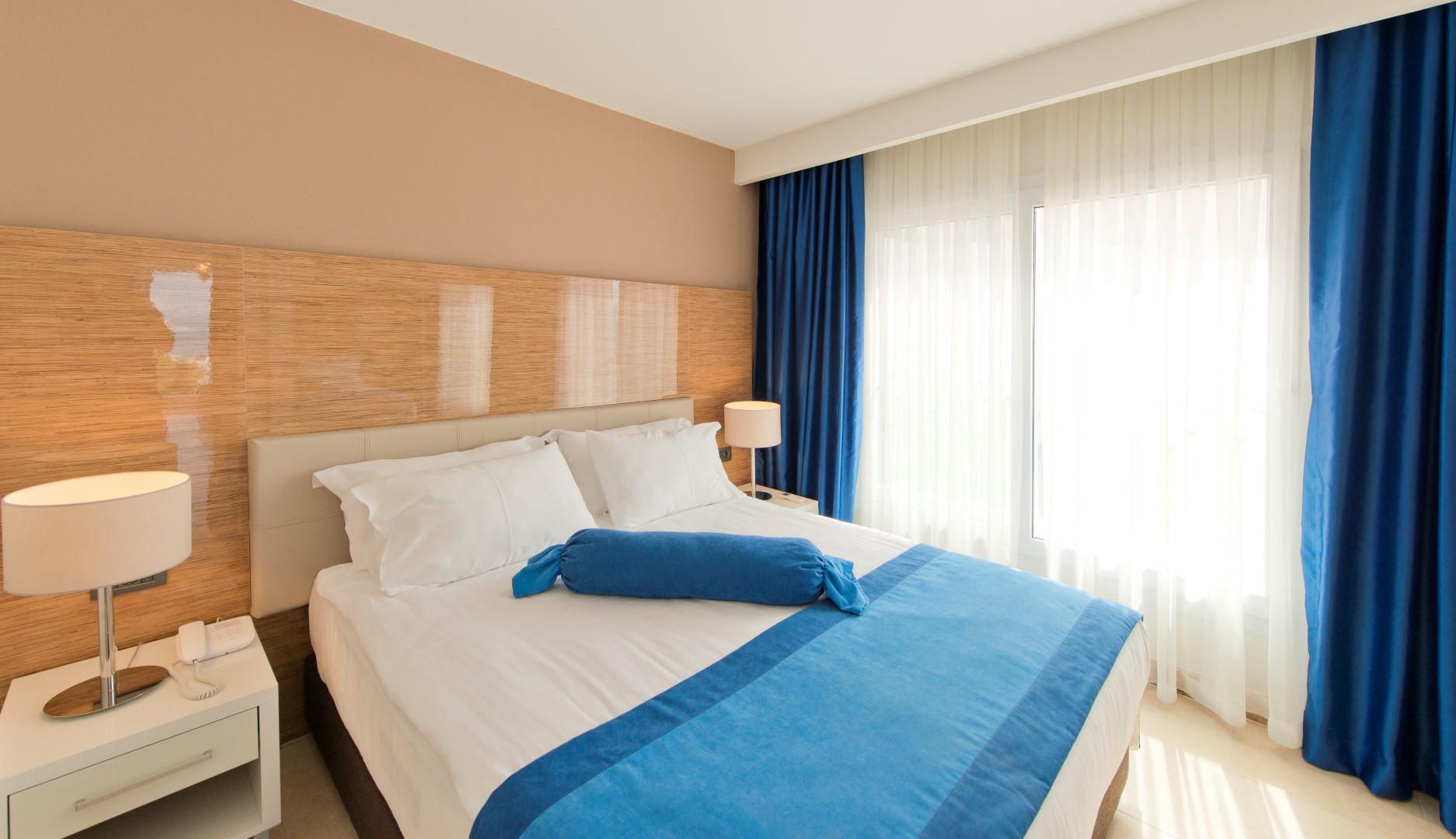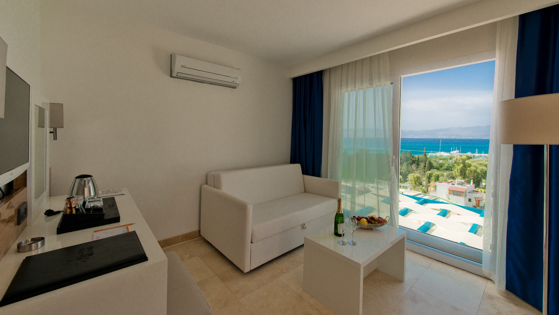 В однокомнатном номере гости размещаются на двуспальной кровати, есть балкон, в ванной комнате душ. Среди удобств кондиционер, мини-бар, сейф, телевизор, телефон, фен. Из номера открывается вид на море.